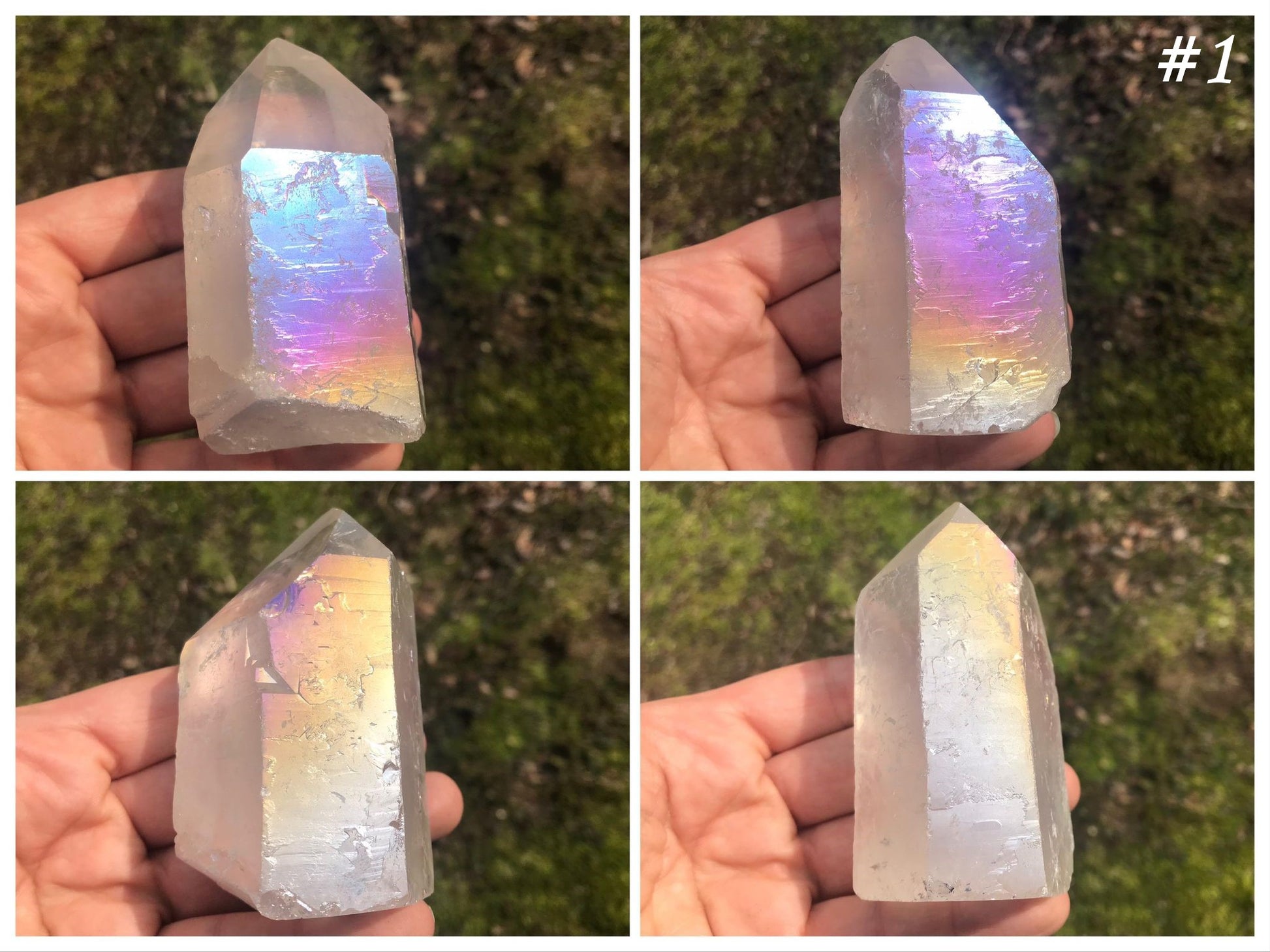 These Angel Aura quartz point towers are exquisitely beautiful. Angel Aura Quartz is created when clear quartz is bonded with Silver and Platium, sometimes gold.