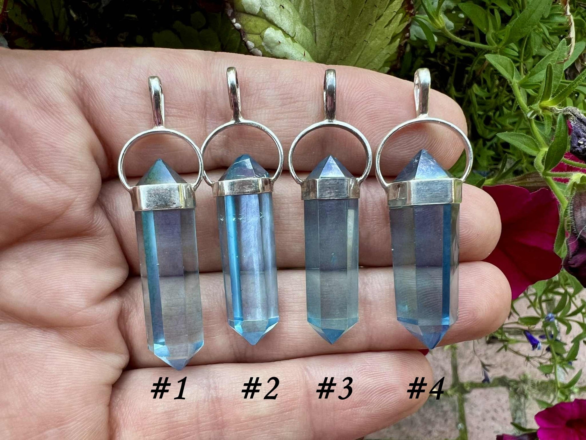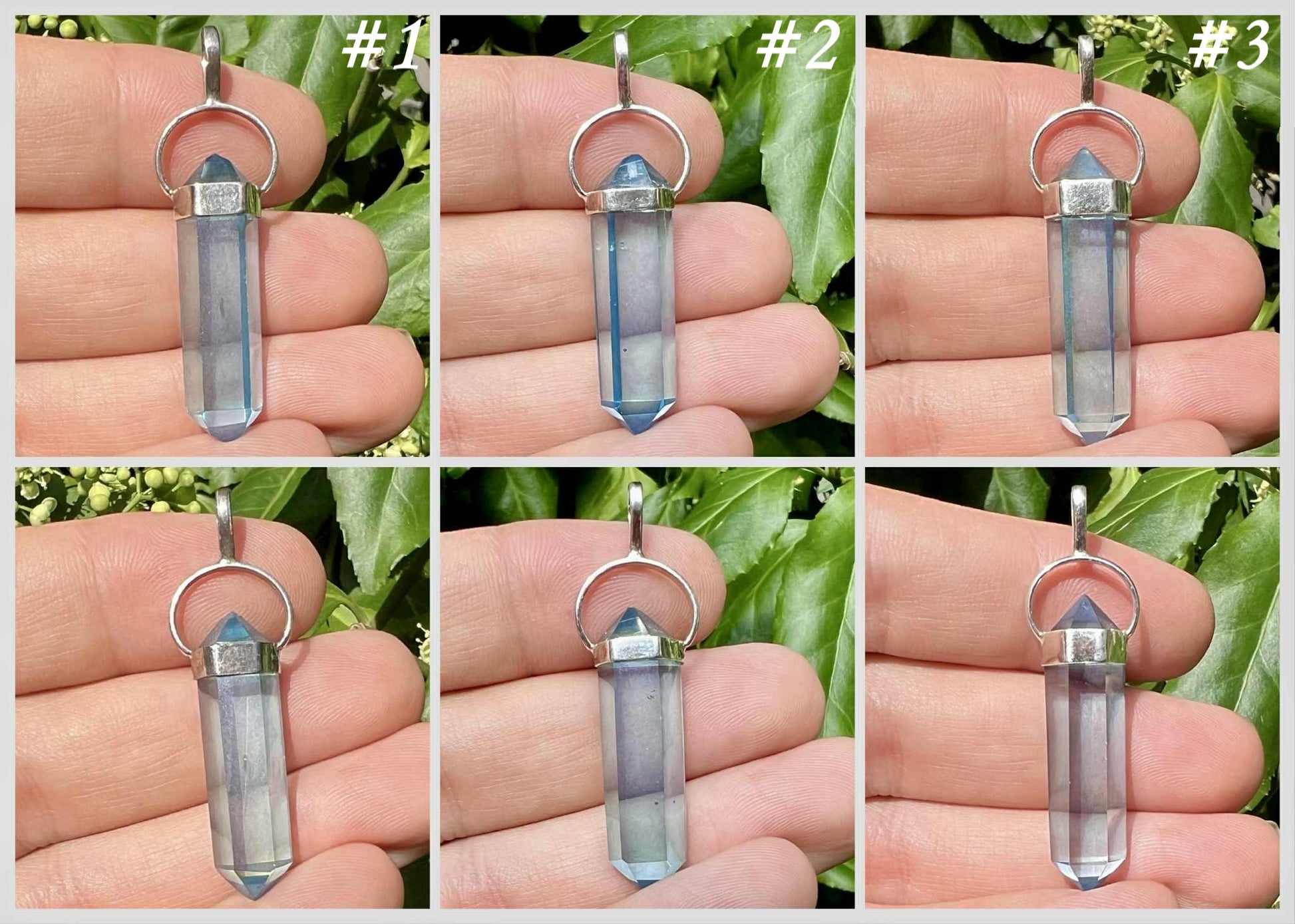 Pictures of the pendants that we currently have in stock are included in this listing so that you can choose your pendant. They are shown in various lighting schemes, but all are a vibrant aqua color. Please choose the pendant that calls to you from the drop-down menu.