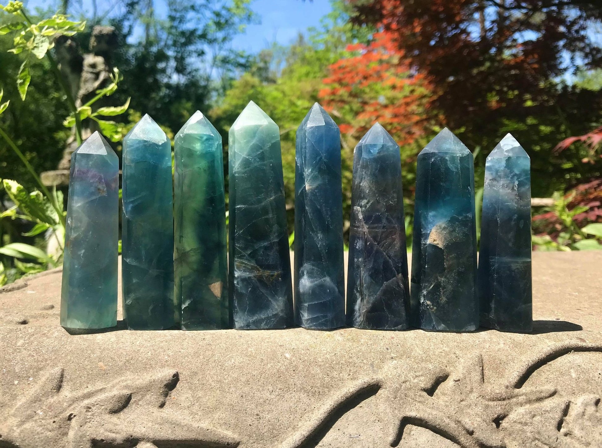 These Blue Rainbow Fluorite towers are absolutely gorgeous! The colors are amazingly vibrant. They would make a wonderful addition to any crystal collection.