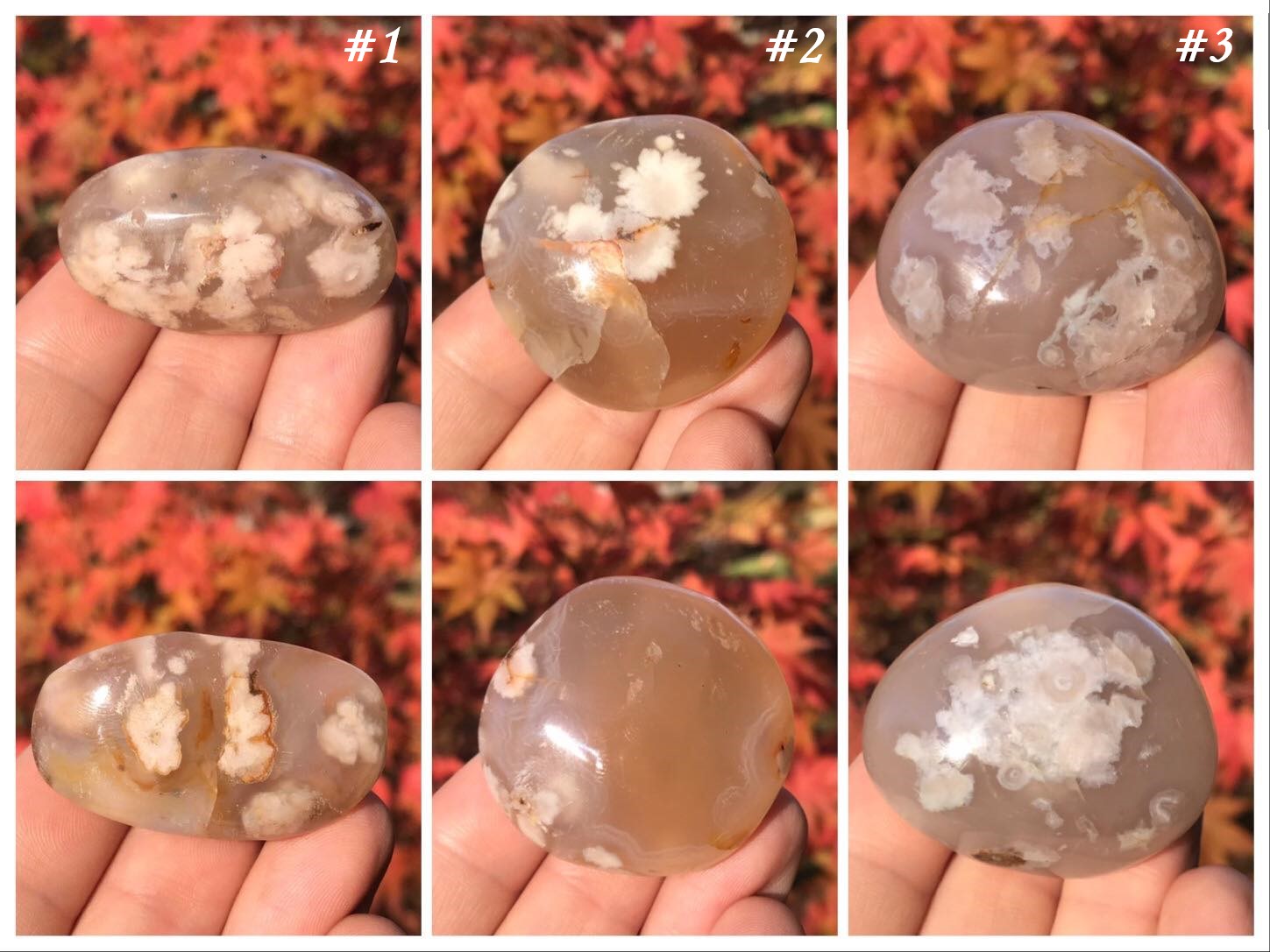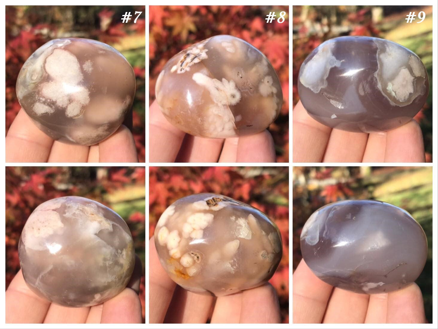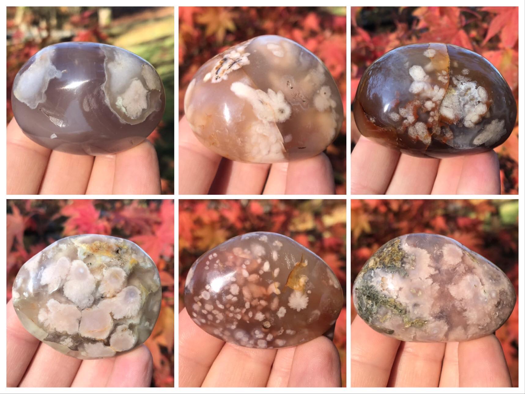 These Flower Agate Palm Stones are absolutely stunning! Also known as Cherry Blossom Agate and Sakura Agate, they each feature remarkable flower-like inclusions. They would make a wonderful addition to any crystal collection.
