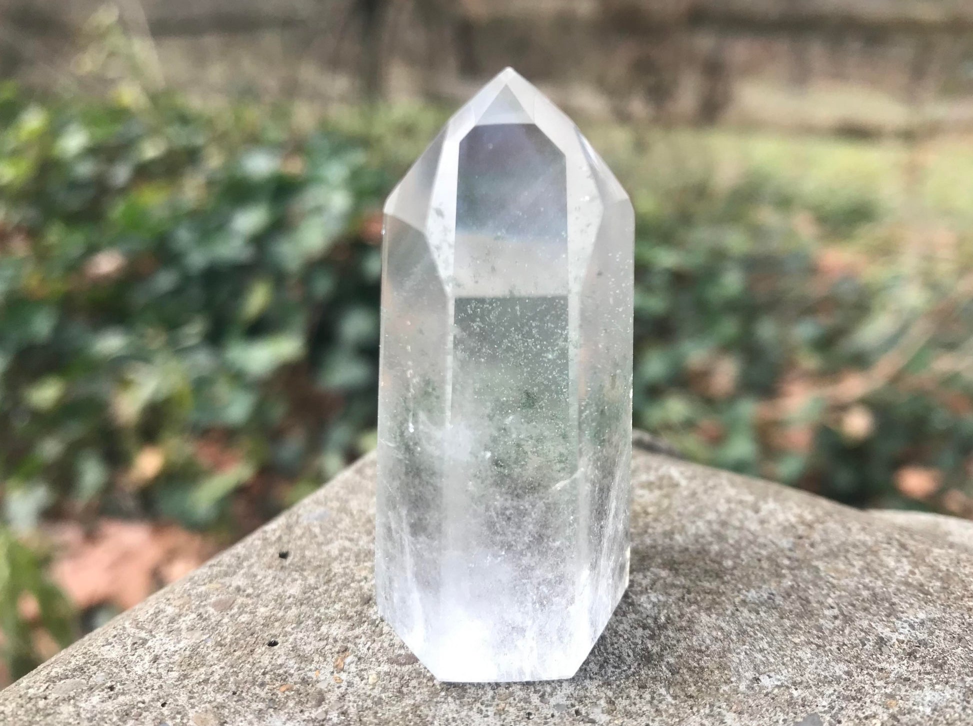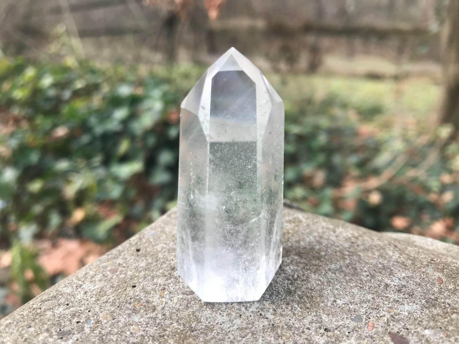 This Garden quartz crystal tower Brazil is extremely beautiful. It is remarkably clear and features some very unique green Chlorite inclusions. It would make a wonderful addition to any crystal collection.