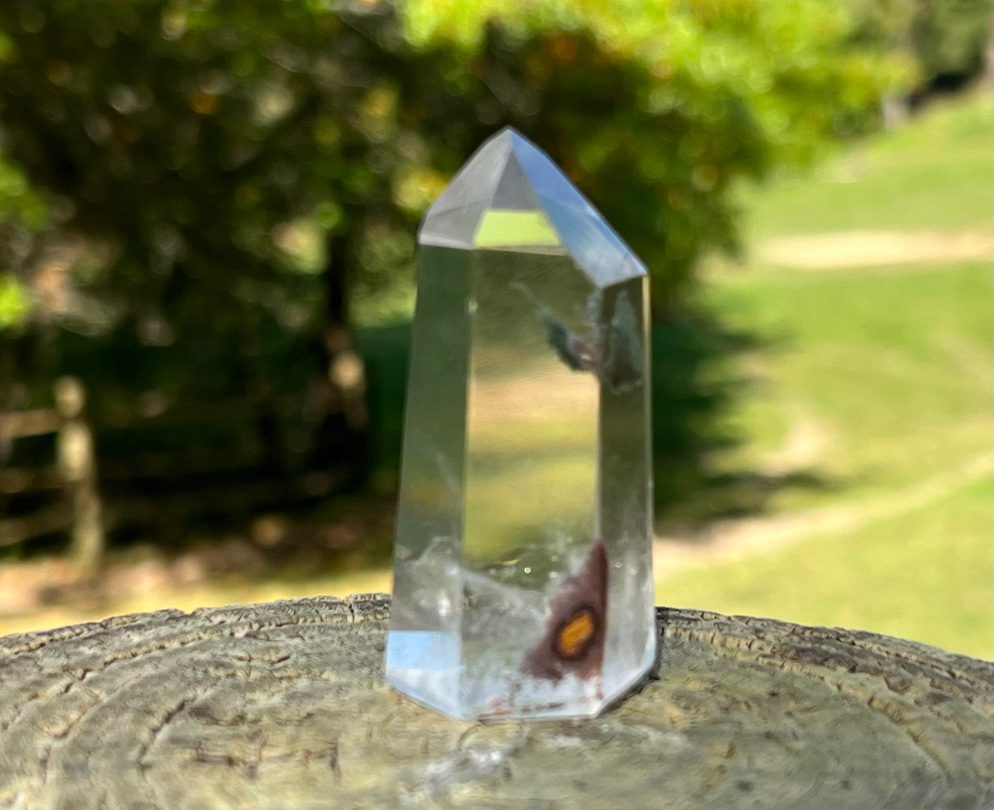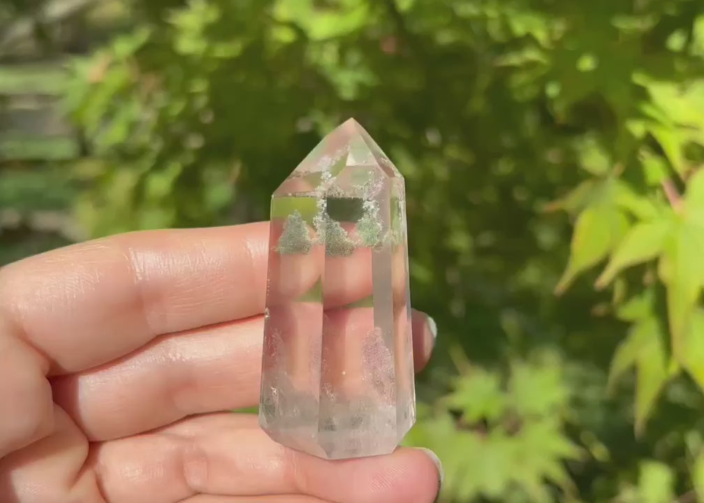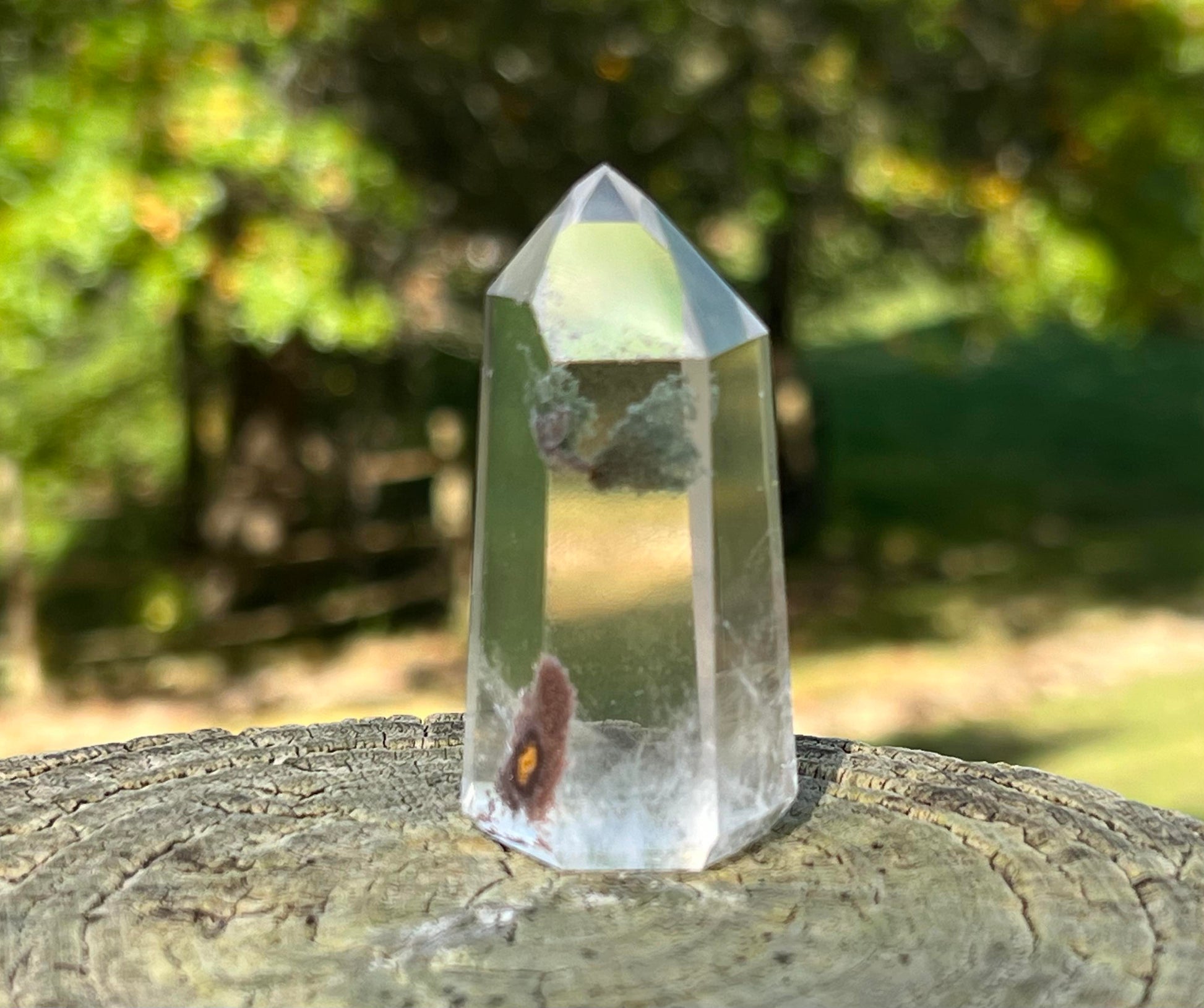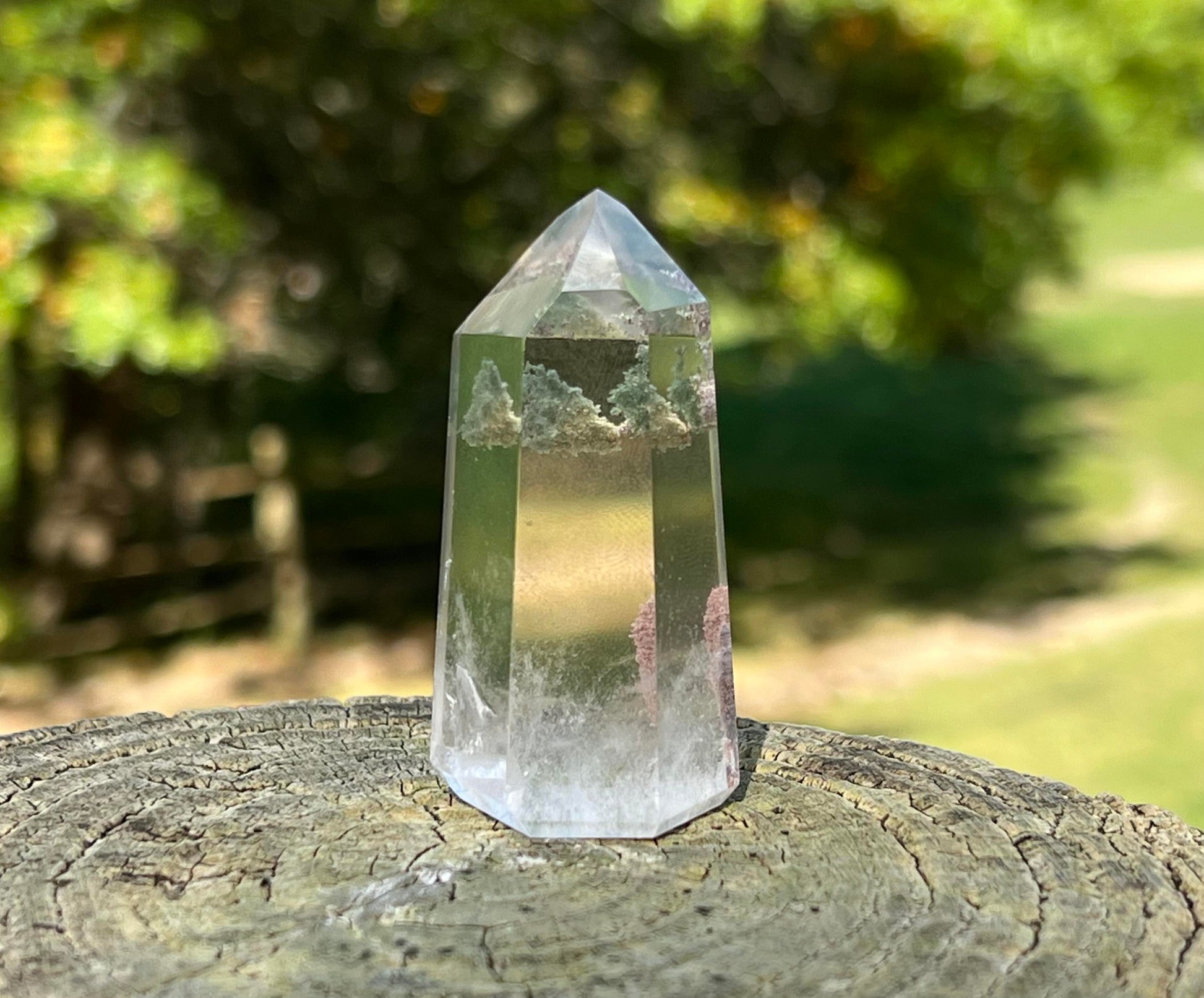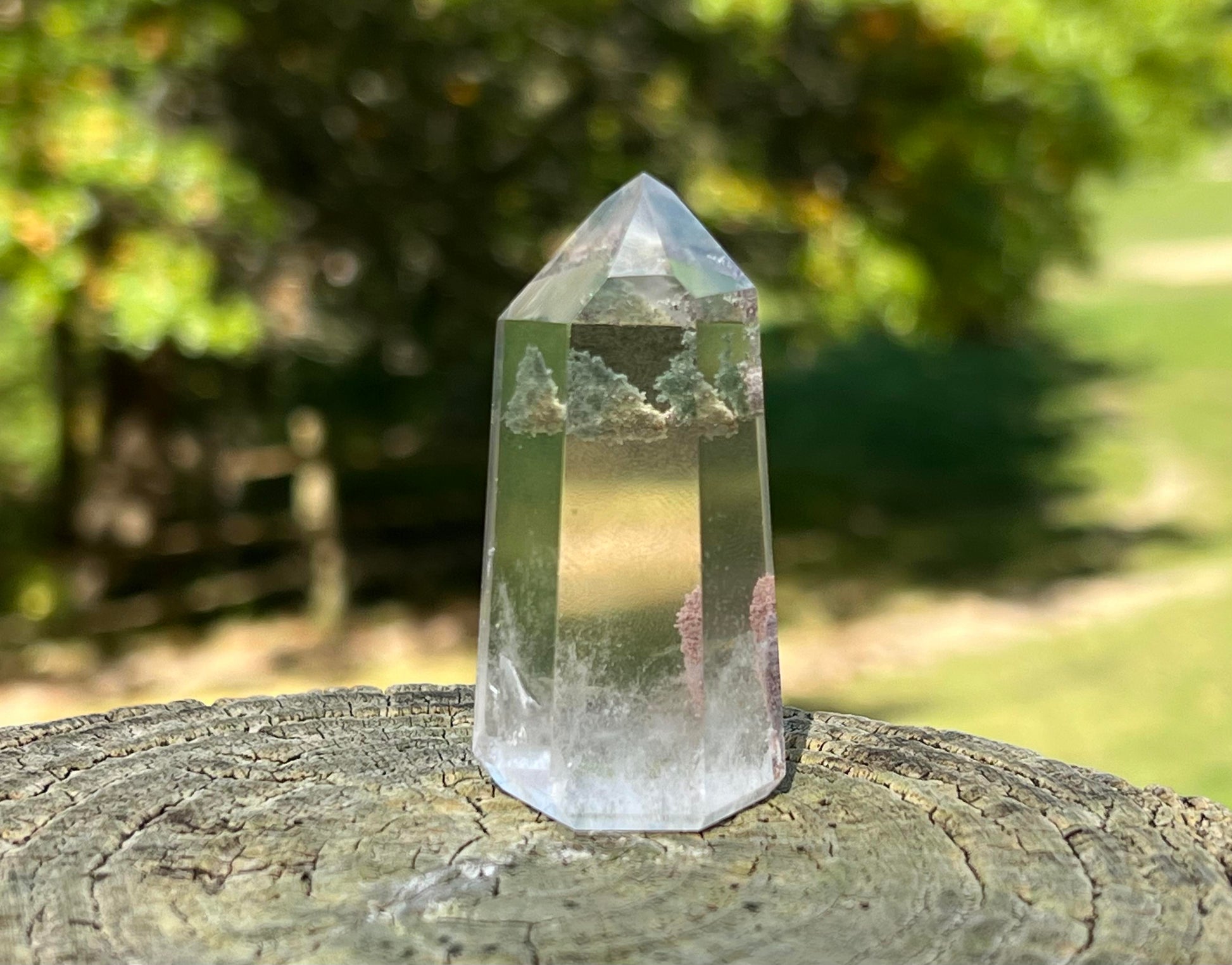 This little Garden Quartz Tower is such a work of art! It is remarkably clear and features such beautiful green and red Chlorite inclusions inside. It would make a wonderful addition to any crystal collection.