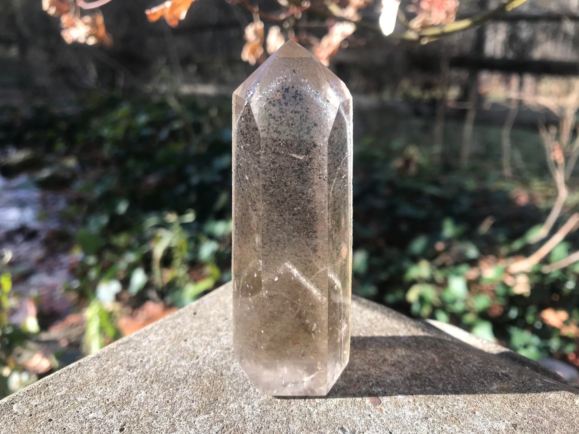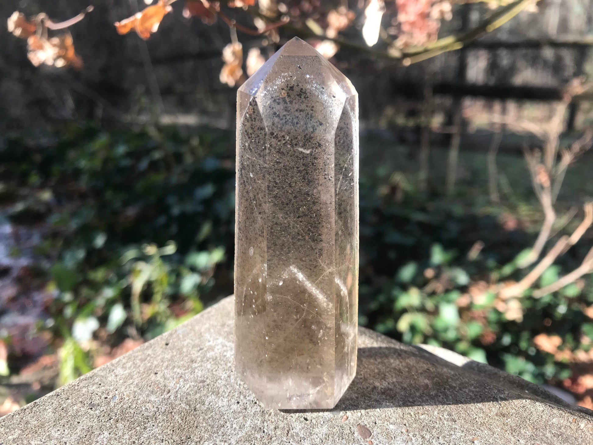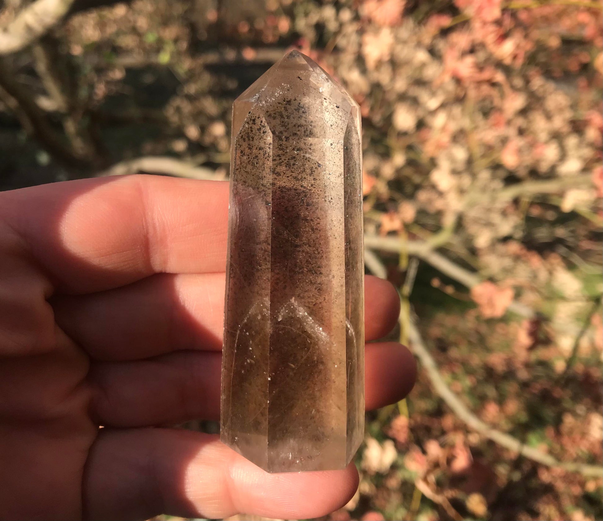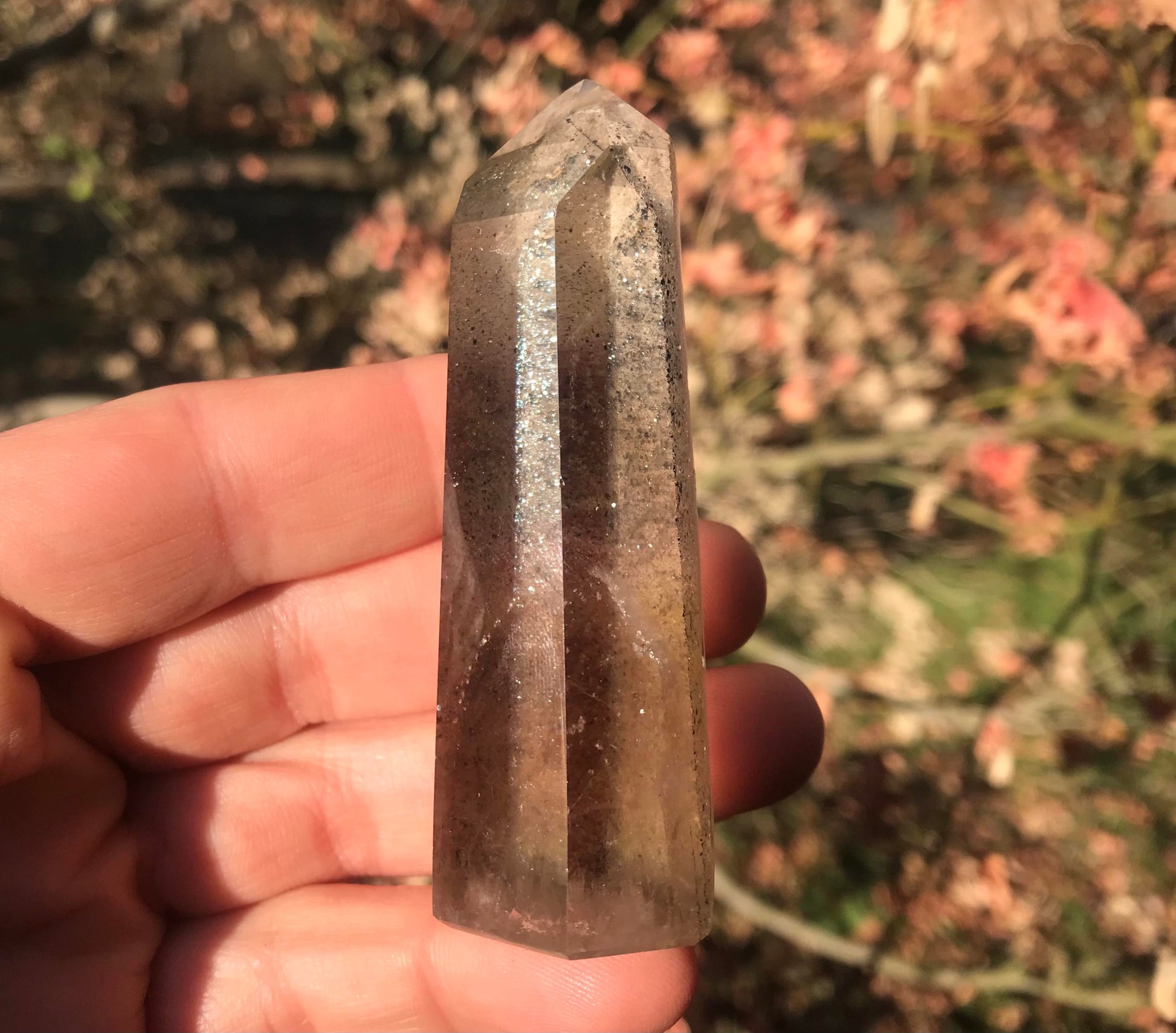 This Smoky Phantom Quartz tower from Brazil is such a beauty! It features a stunning world of phantoms and dotted chlorite inclusions inside. The crystal sparkles inside with what may be inclusions of mica. This incredibly unique piece would make a spectacular addition to any crystal collection.