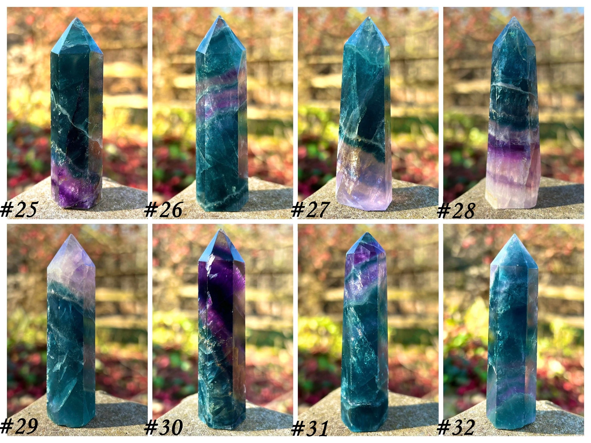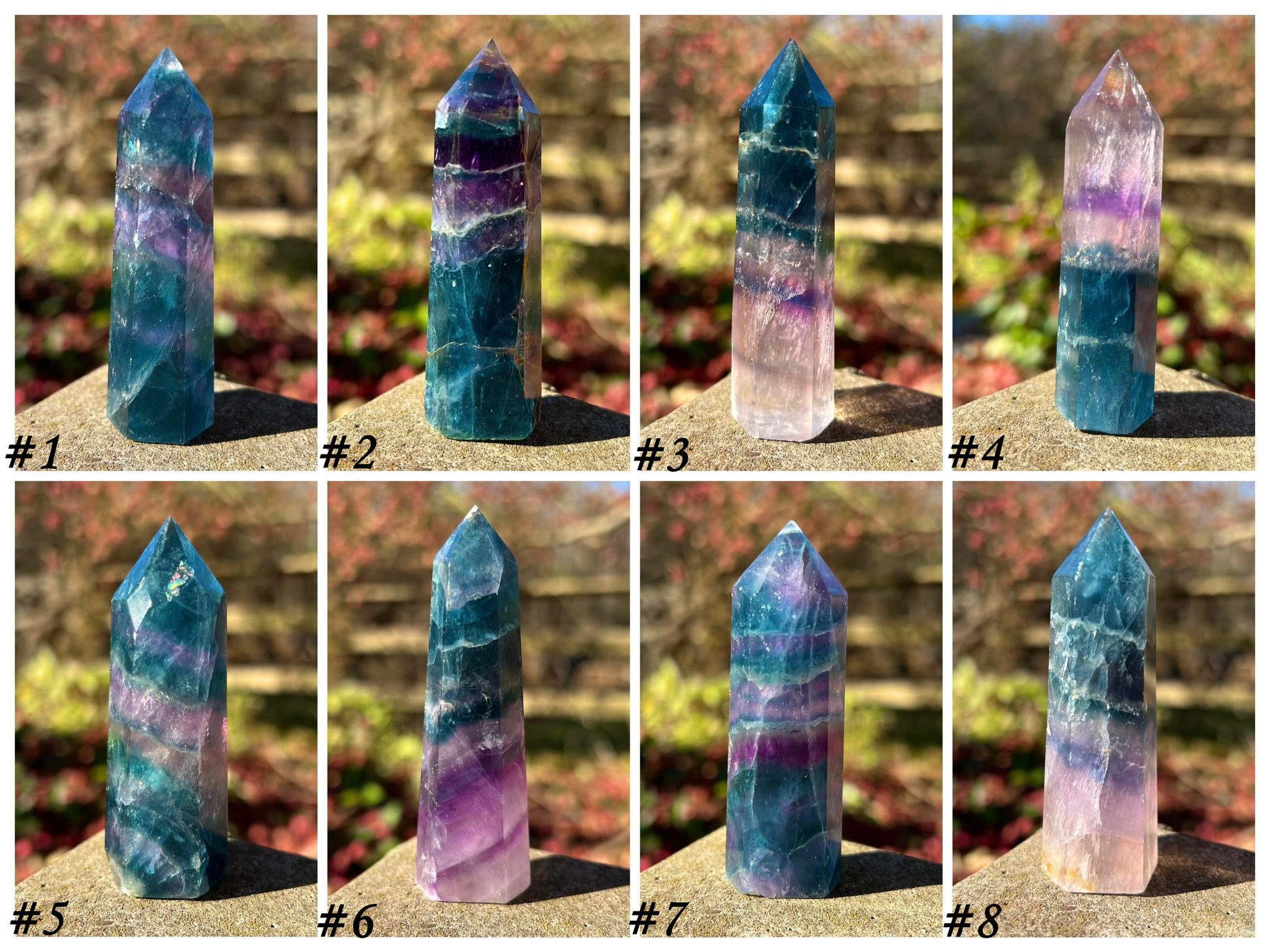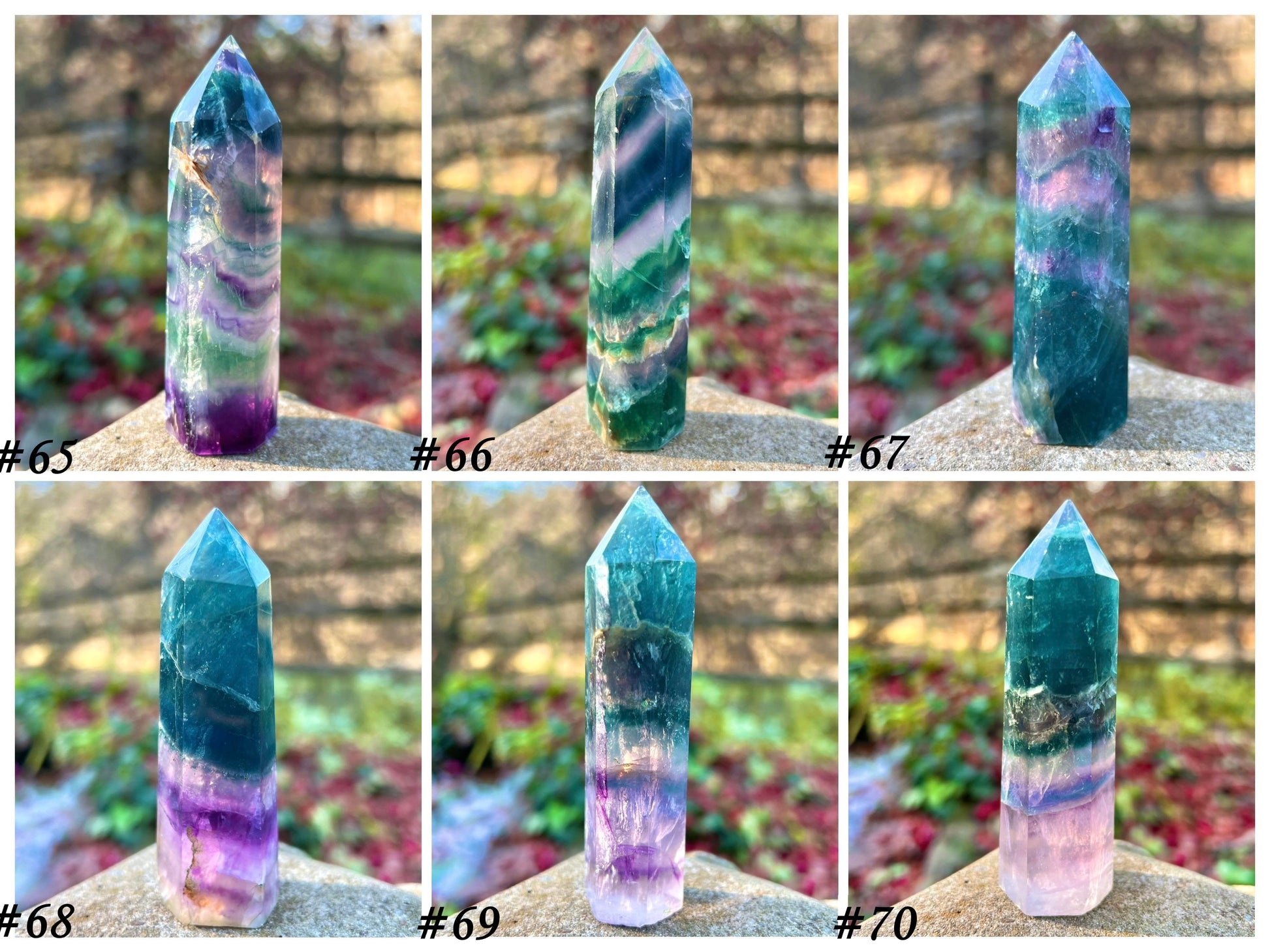 These blue and purple Rainbow Fluorite towers are absolutely gorgeous! The colors are amazingly vibrant. They would make a wonderful addition to any crystal collection.