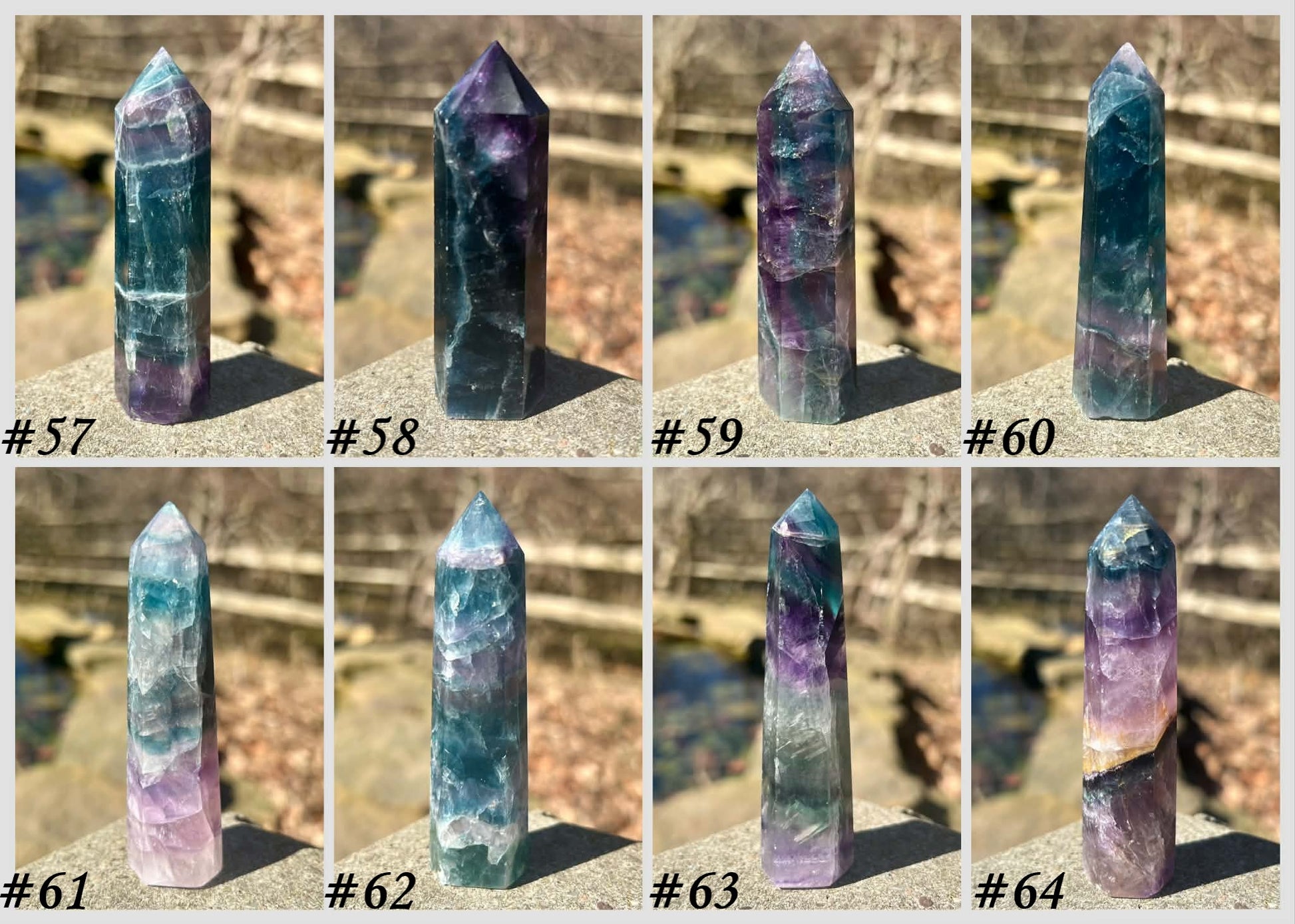 Please note that as these crystals are products of nature, they may have small imperfections on them. #12,#24, #30, #44 and #51 have an indentation on one corner, #16, #26 #49, #53 and #60 have a tiny indentation/chip at the tip.