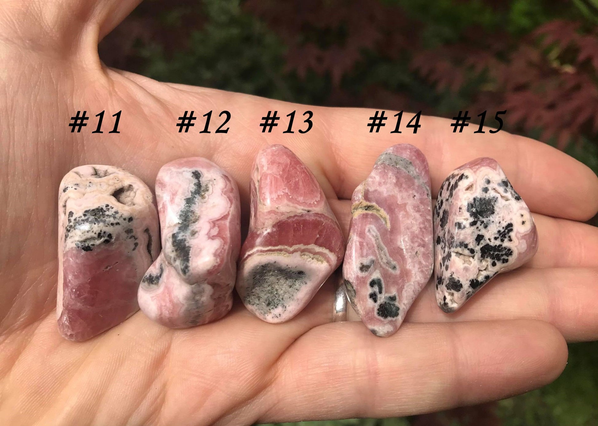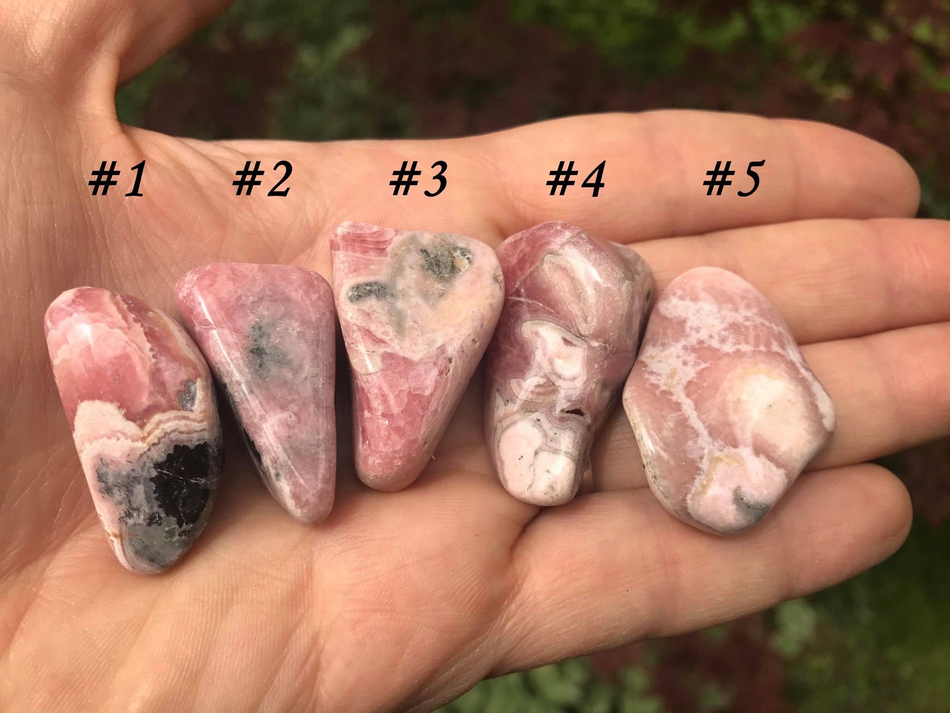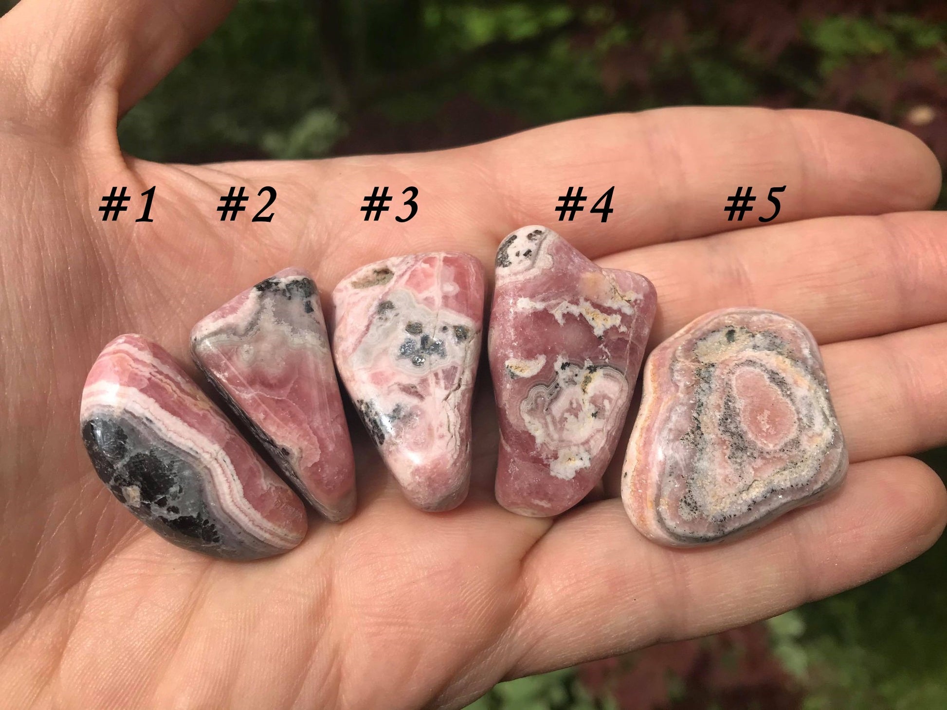 This listing is for one (1) Rhodochrosite tumbled stone which measures 30-49 mm (1.18" - 1.92"). The stones are shown front and back and are numbered so that you can choose your stone.