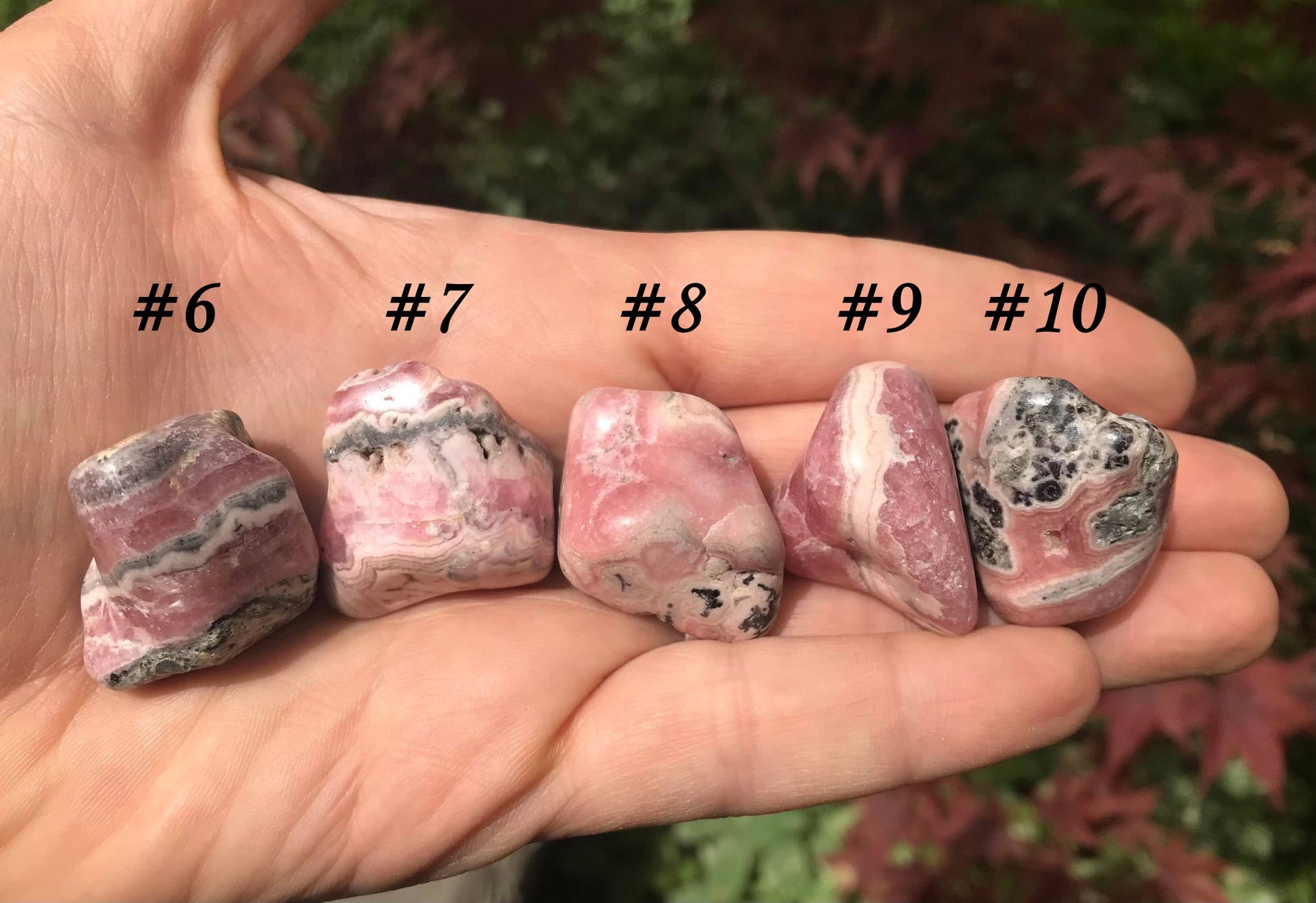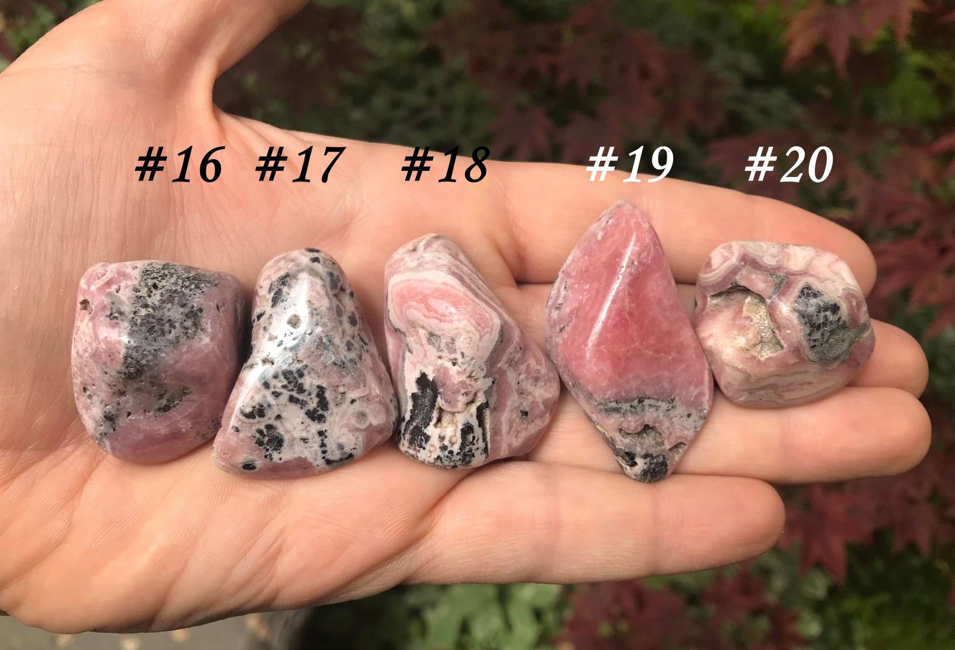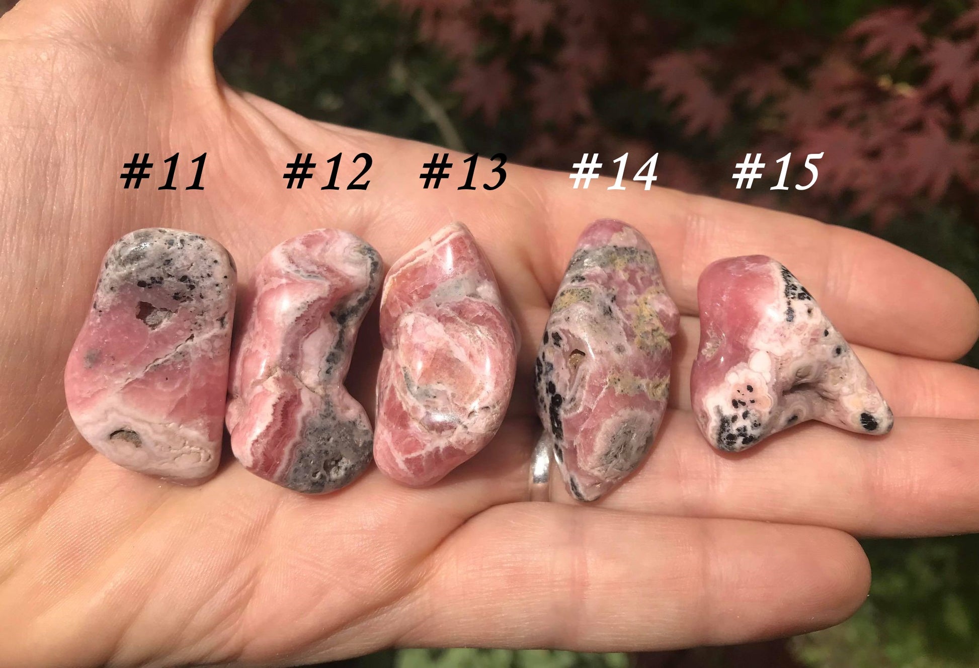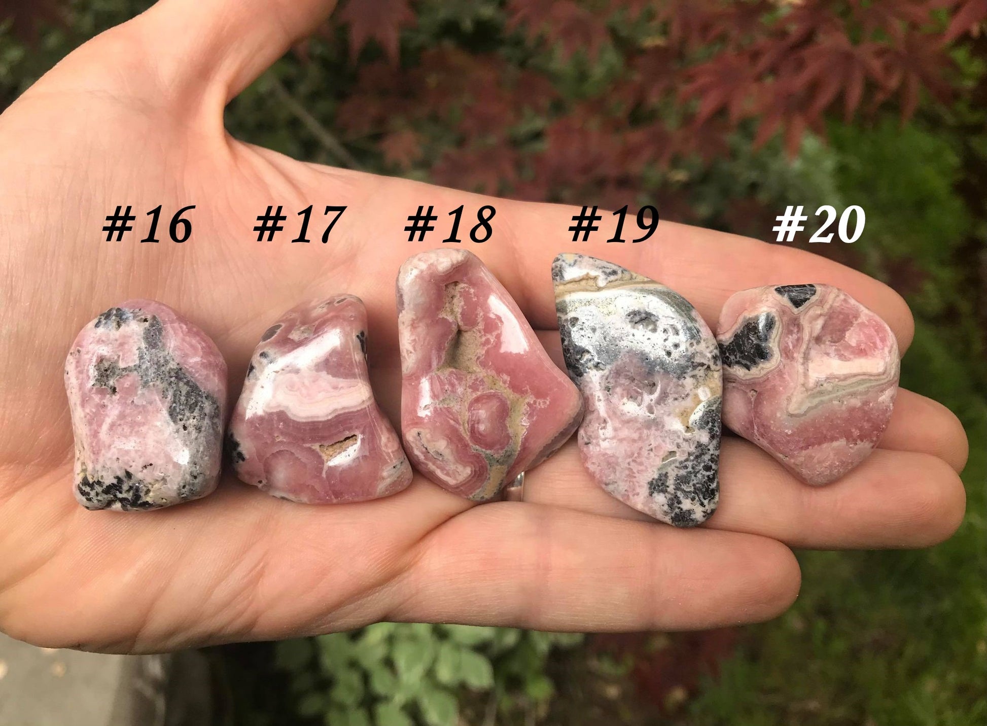 This listing is for one (1) Rhodochrosite tumbled stone which measures 30-49 mm (1.18" - 1.92"). The stones are shown front and back and are numbered so that you can choose your stone.