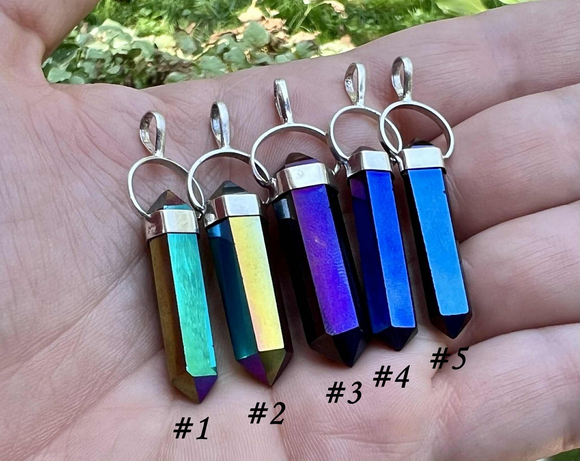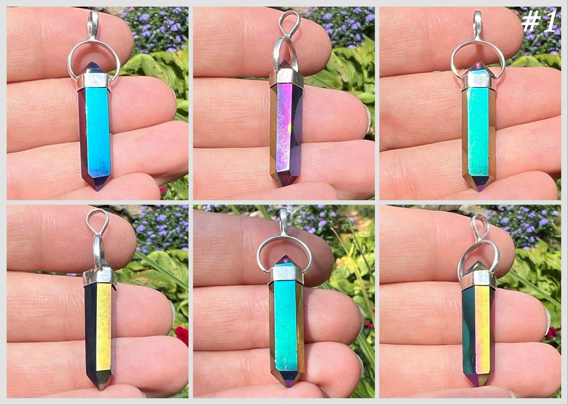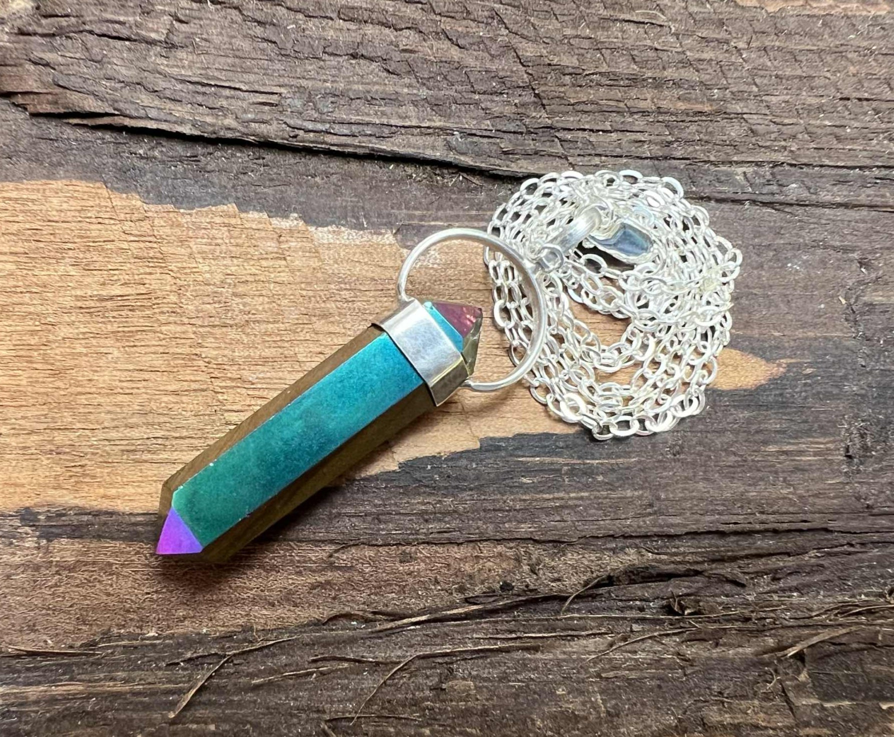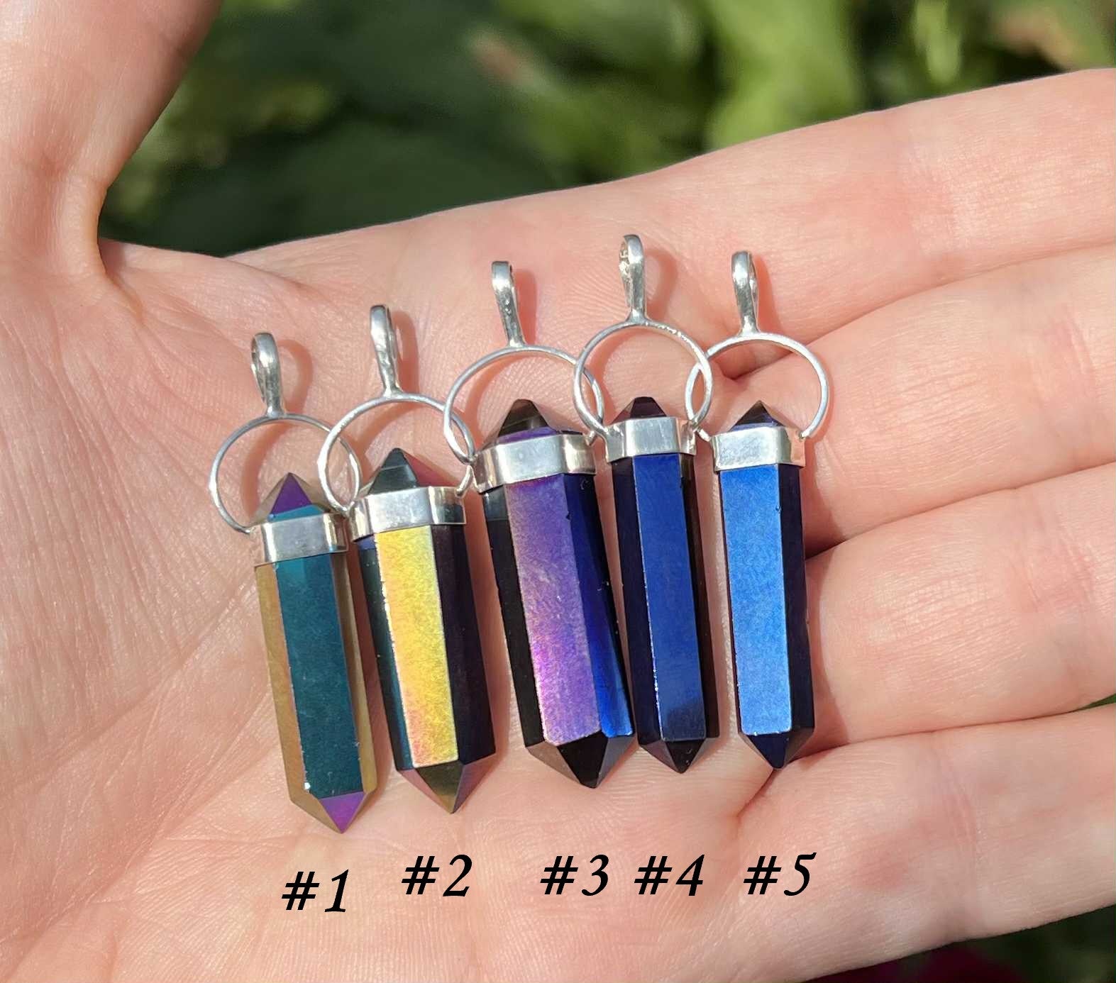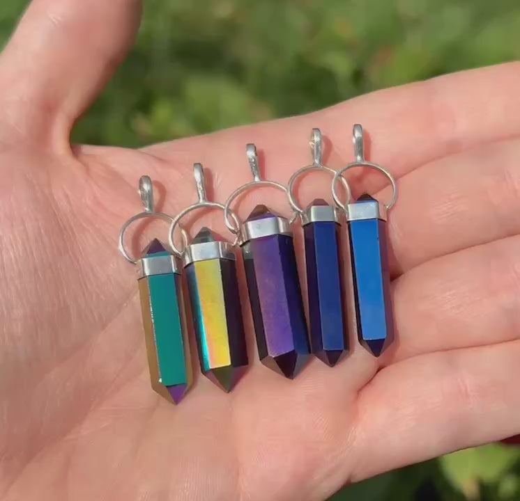 Titanium Aura Quartz is created in bonding precious metals to quartz. This creates its vibrant hues. The pendants contain natural crystals that are perfectly imperfect. They have tiny crevices that were there before the aura treatment process. Please see the pictures for details.