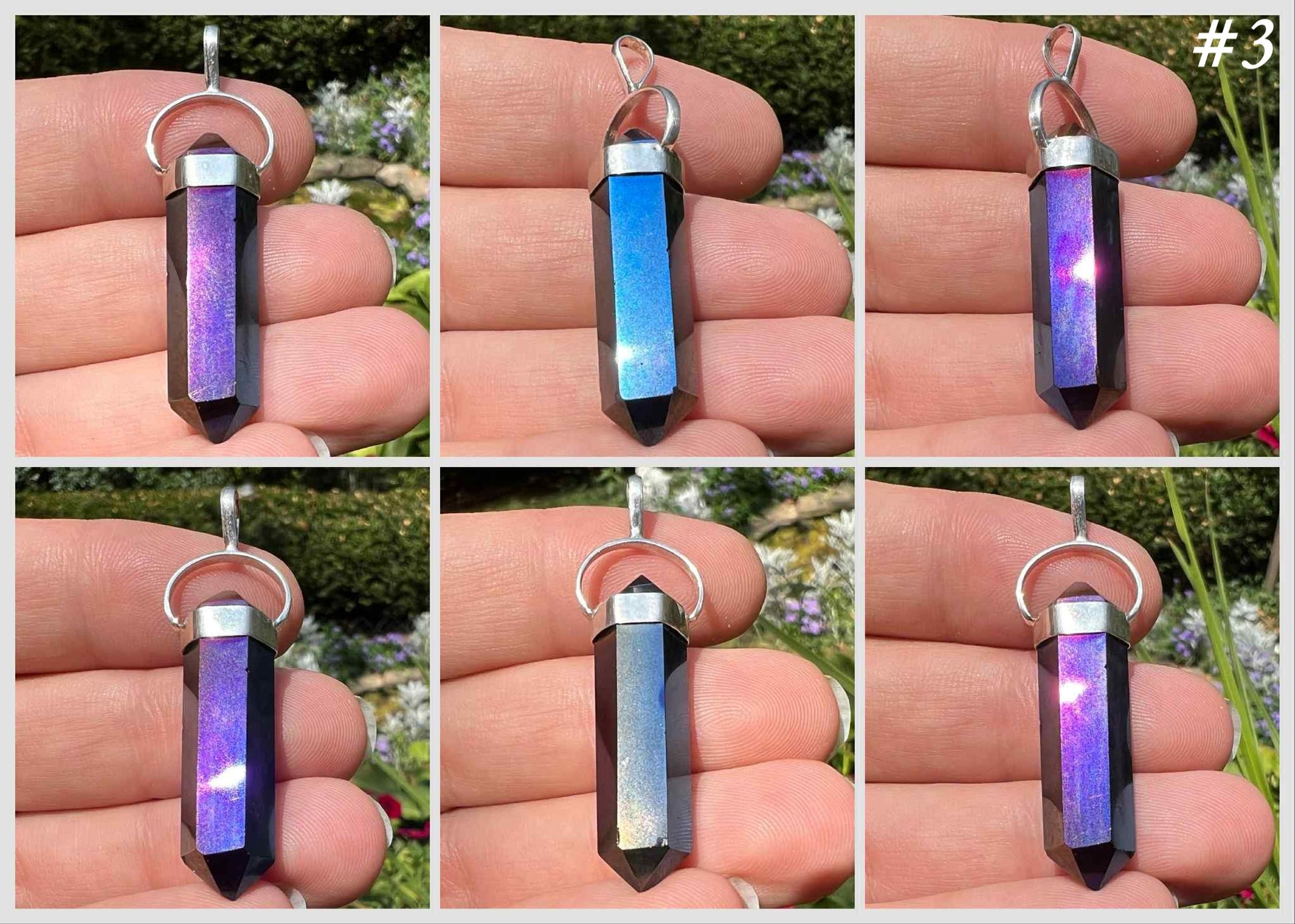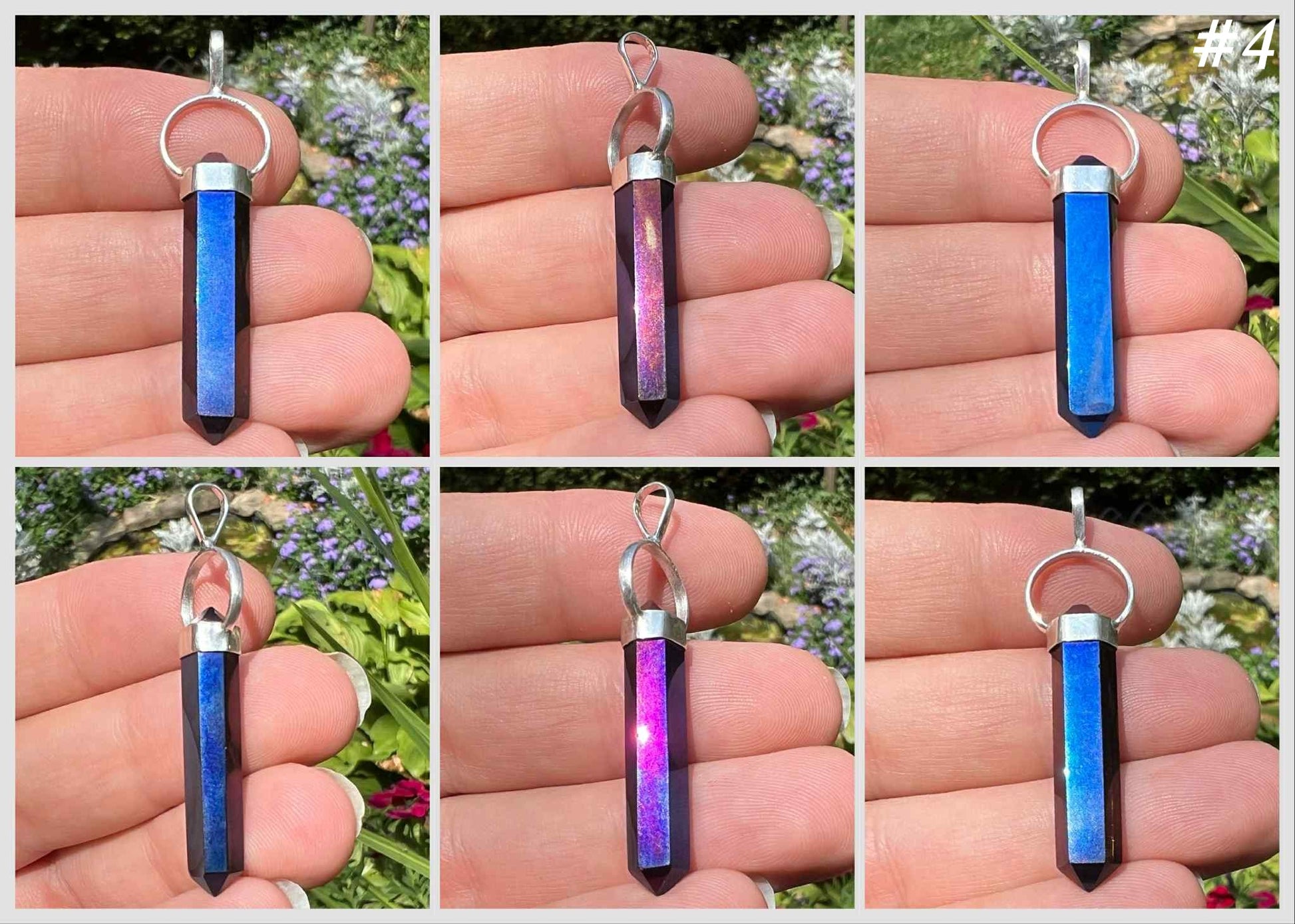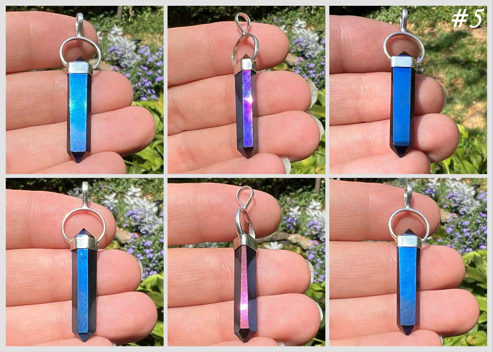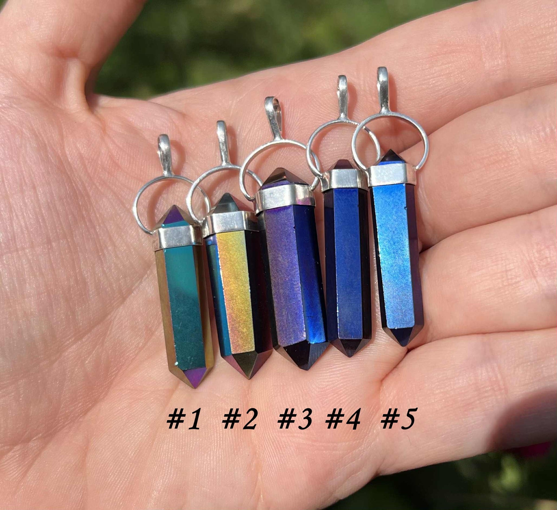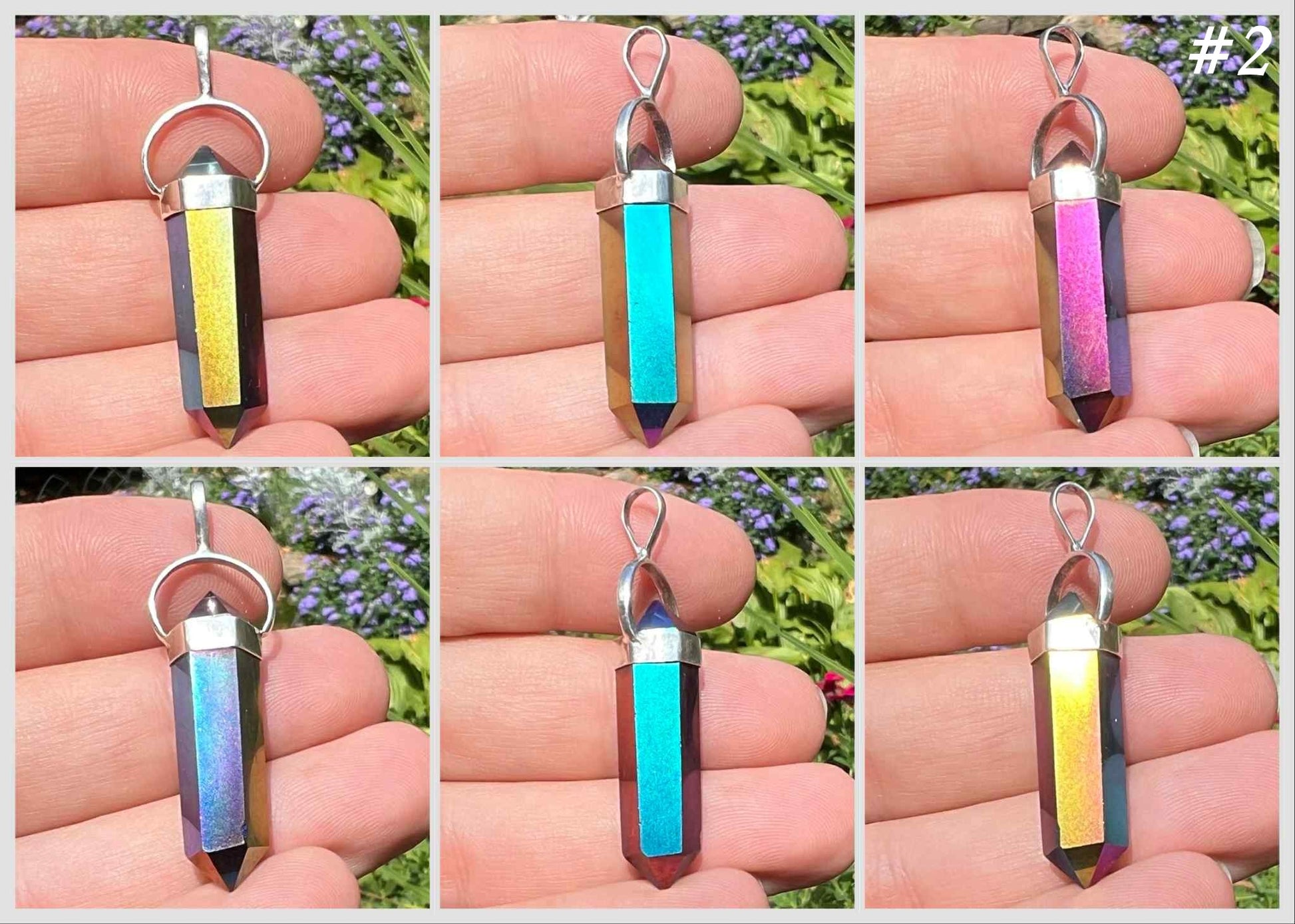 Titanium Aura Quartz is created in bonding precious metals to quartz. This creates its vibrant hues. The pendants contain natural crystals that are perfectly imperfect. They have tiny crevices that were there before the aura treatment process. Please see the pictures for details.